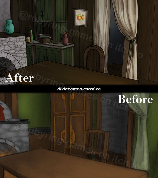 The changes here are far less subtle. Before, the room felt barren and unrealistic. revamping the scenery in the background made the place feel more lived in. It’s also suitable for Avan. He loves green! Maybe he painted that cabinet himself. It’s good to imbue a bit of your characters into their environments. It makes everything feel just a little more cohesive.